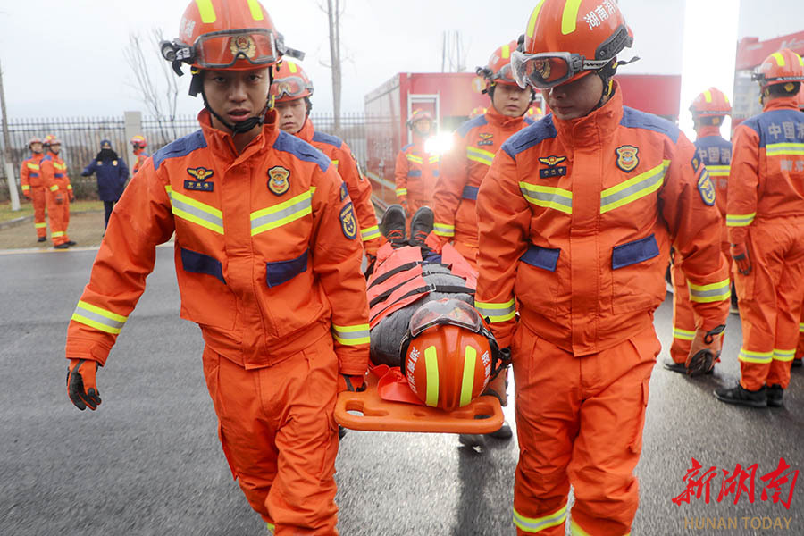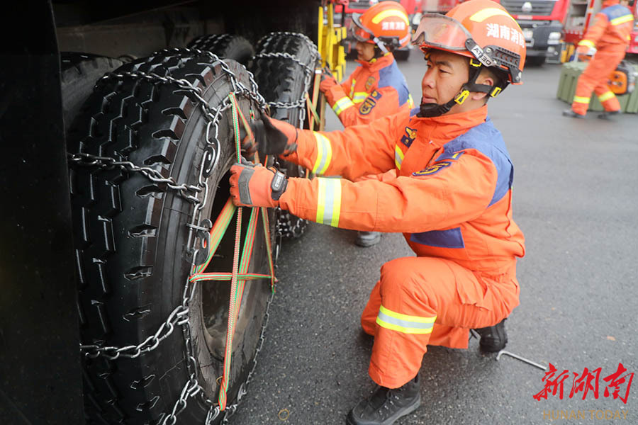 1月19日,常德市消防救援支队针对低温雨雪冰冻恶劣天气开展拉动演练。通过防滑链安装、伤员转运等实战科目,提升队伍应对低温雨雪冰冻天气的应急救援能力。 陈自德 摄(湖南图片库)