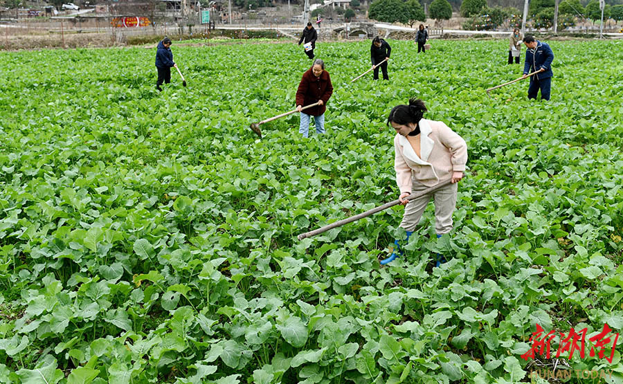 1月19日,绥宁县关峡苗族乡大园村,村民在进行锄草作业。大寒节气,油菜田间管理进入关键时期,该县农民抢抓农时在油菜地里进行除草、施肥等农事作业,为油菜丰产打好基础。 滕治中 黄开龙 摄影报道(湖南图片库)