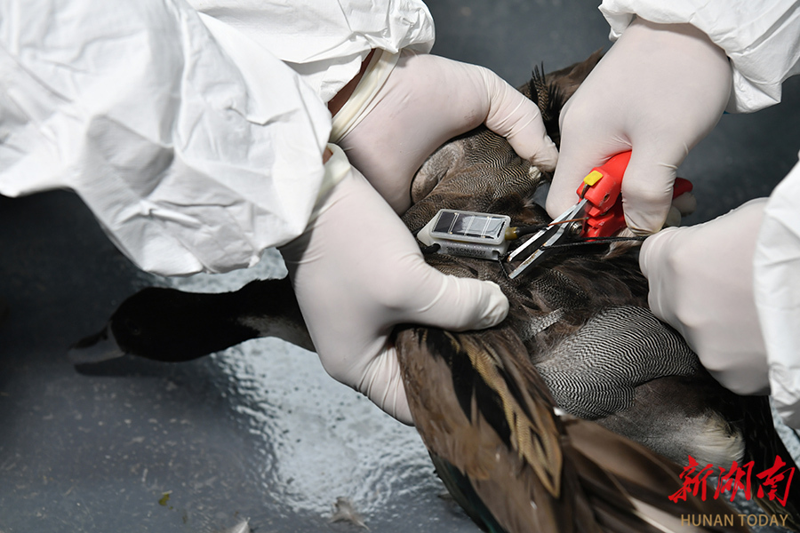 1月19日,岳阳市野生动物收容救护站,工作人员给经过救助已恢复健康的国家“三有”保护动物针尾鸭佩戴定位器,准备放飞。此次放飞是该救护站今年首批救护放飞。目前,该站目前仍有200余只候鸟在接受救护治疗。 湖南日报全媒体记者 田超 彭雅惠 摄影报道