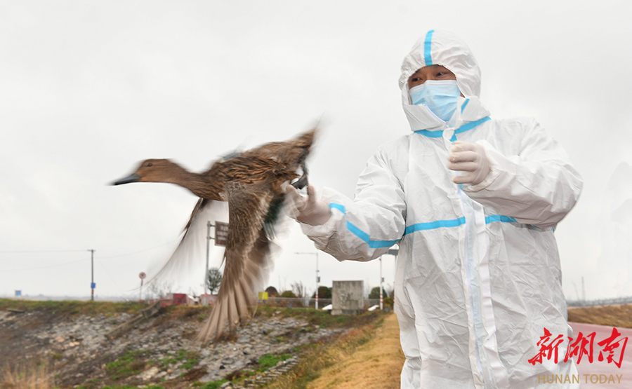 1月19日,岳阳市君山区洞庭湖畔,岳阳市野生动物收容救护站工作人员将2只佩戴了定位器的国家“三有”保护动物针尾鸭放飞。此次放飞是岳阳市野生动物收容救护站今年首批救护放飞。目前,该站目前仍有200余只候鸟在接受救护治疗。 湖南日报全媒体记者 田超 彭雅惠 摄影报道