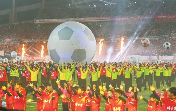 2025年12月21日晚,株洲市体育中心,湘超联赛赛前文艺表演点燃现场火热气氛。17周内98场赛事联动2000余场文旅活动,2025湘超联赛吸引241万多人次观赛,带动文旅消费近137亿元,树起“体育+文旅”融合发展新标杆。湖南日报全媒体记者 郭立亮 摄