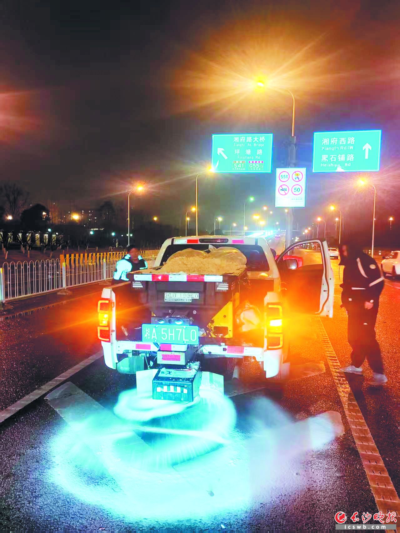 寒夜刺骨,桥面如镜。1月19日晚,在万家丽路与三一大道互通的高架桥上,尹少斌手持测温仪,迎着凛冽寒风,检测着桥面温度。这是启动融雪除冰作业的关键前奏——每隔一小时,他便要这样测量一次。尹少斌说:“一旦桥面湿滑且温度低于零下1℃,我们立即开始撒盐。”