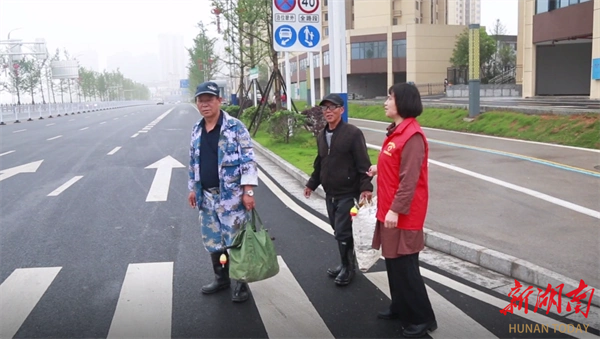 志愿服务队队长黄满凤正劝导行人安全过斑马线。张潇悦摄