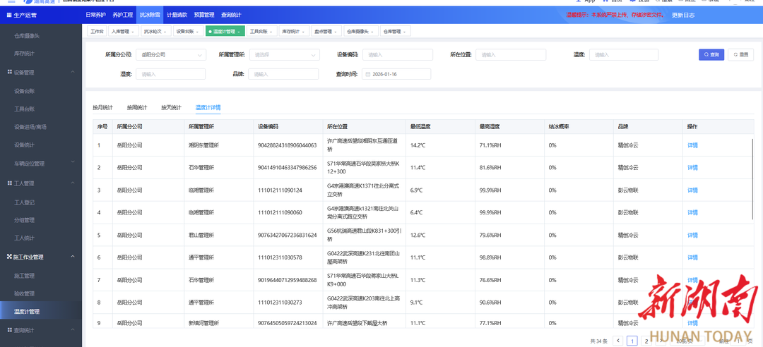 与往年不同的是,湖南高速集团岳阳分公司今年投入使用的智能抗冰除雪系统正成为抵御严寒的“智慧大脑”。系统集成了入库管理、设备台账、温度计管理、盘点管理等九大核心功能,通过网络覆盖全路段。