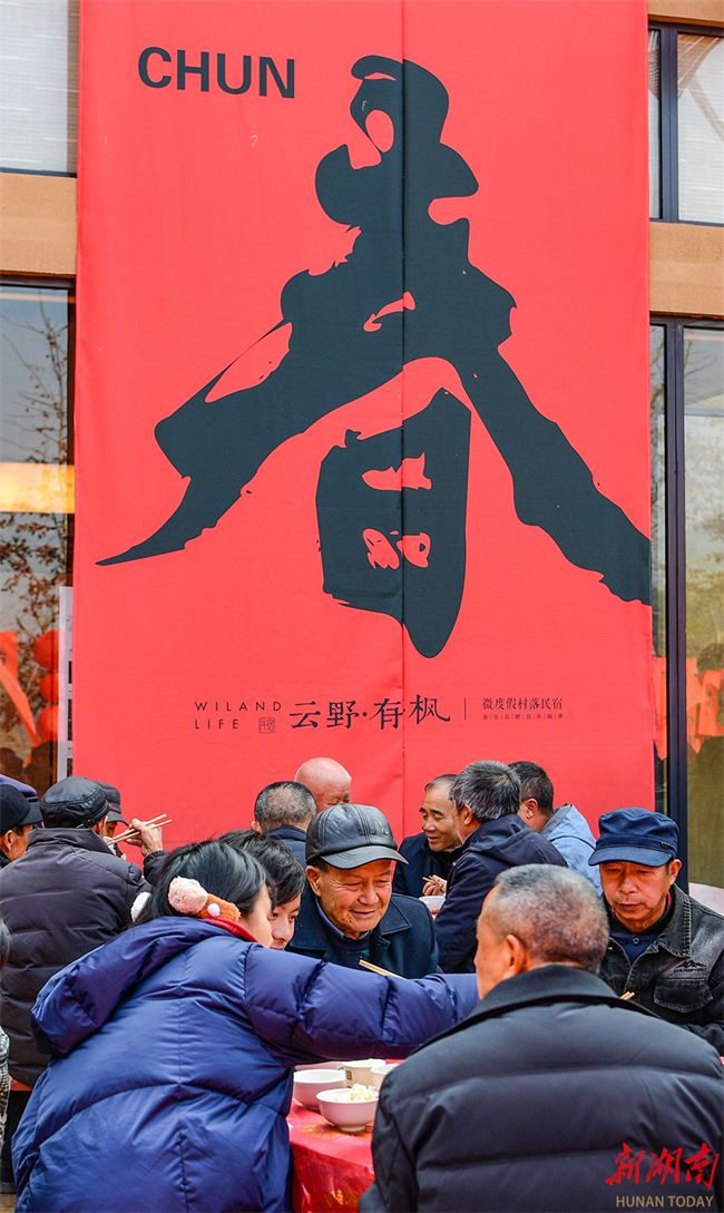 On January 18, a New Year reunion themed "Shazhu Yan" (a traditional feast centered around freshly slaughtered pork) was held in Zhulinping Village, Menlouxia Yao Township, Xintian County. Through various festive activities, such as watching folk performances, tasting local food, and purchasing New Year goods, villagers and tourists enjoyed themselves in a festive ambiance of the Yao community. The photo shows local Yao people and tourists watching the Yao long-drum dance performance. (Photo/Liu Guisiong and Chen Zhining)