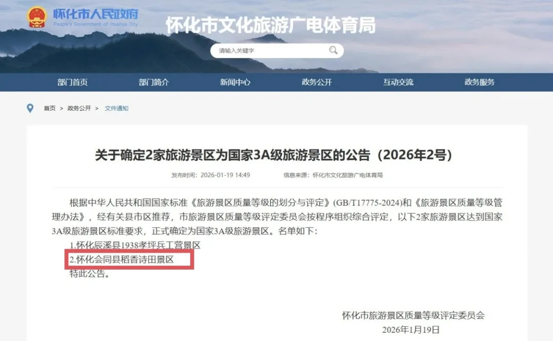 湖南日报·新湖南客户端1月20日讯(记者 周紫云 通讯员 林思如)1月19日,怀化市旅游景区质量等级评定委员会发布公告,会同县堡子镇稻香诗田景区被正式确定为国家3A级旅游景区。这标志着会同县在推动文旅融合、赋能乡村振兴方面取得又一重要成果,也为当地乡村旅游发展揭开了新篇章。
