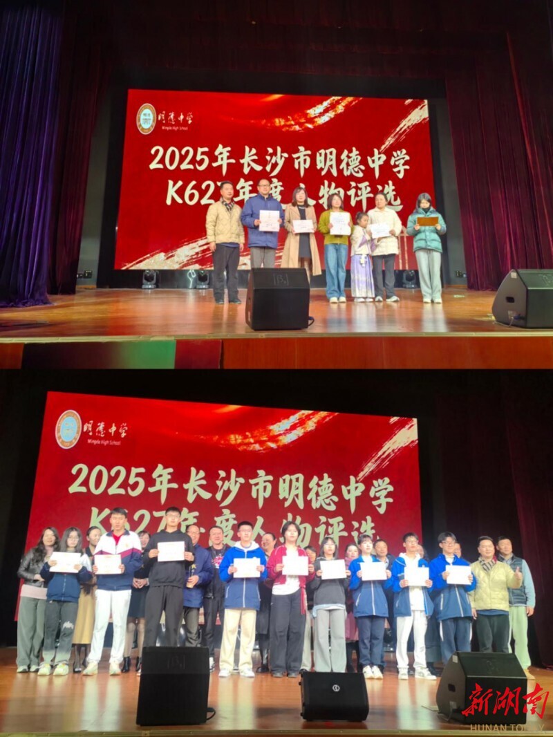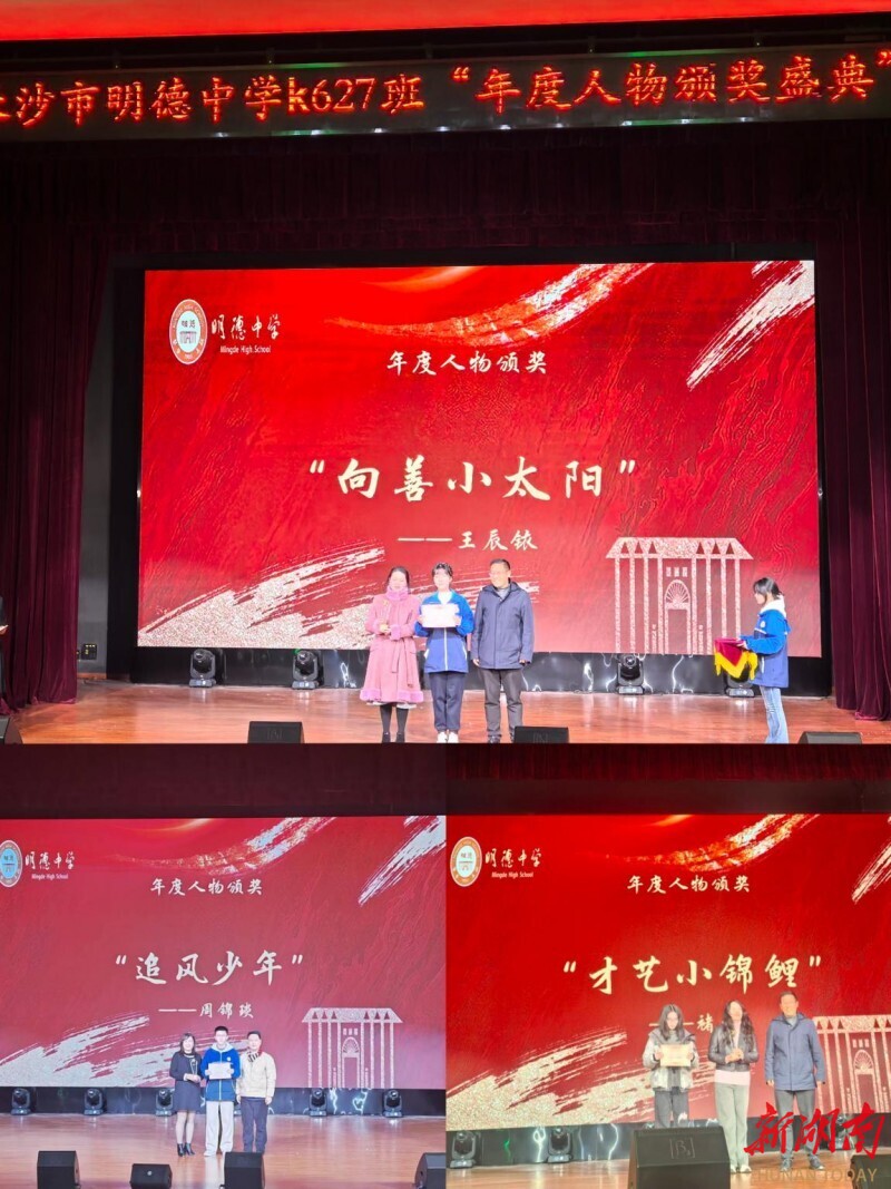 2026年1月17日下午,长沙市明德中学高二年级K627班以“2025年长沙市明德中学K627年度人物评选”为主题,在校园内举办了一场别开生面的家校互动活动。活动以颁奖盛典为核心,融合文艺表演、传统文化展示与集体仪式,生动诠释了明德中学“五育融通”的育人理念,展现了学生综合素质的全面发展,为师生和家长呈现了一场兼具视觉冲击与青春温度的盛宴。