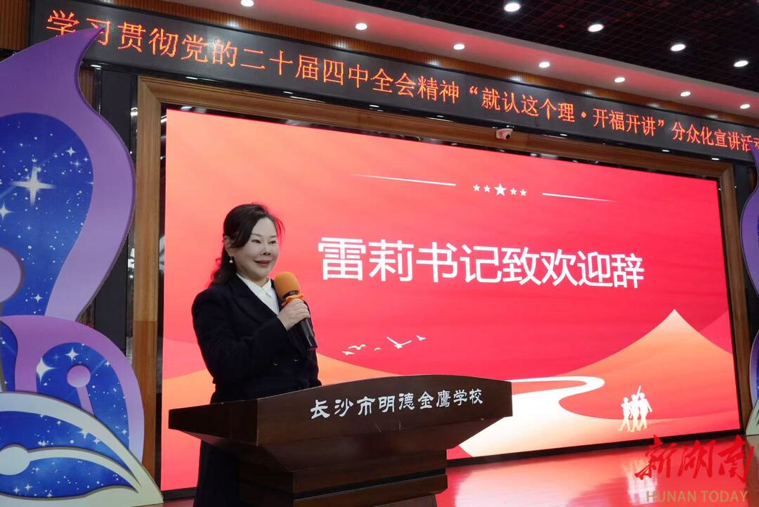 新湖南客户端1月20日讯(通讯员 颜欢)1月19日下午,长沙市明德金鹰学校志尚楼一楼多功能厅内暖意融融、氛围热烈,学习贯彻党的二十届四中全会精神“就认这个理・开福开讲”分众化宣讲进校园活动在此圆满落幕。本次活动由中共长沙市开福区委宣传部主办,开福区教育局、长沙市明德金鹰学校联合承办,由中共长沙市委宣传部指导,开福区教育局相关领导、洪山片兄弟学校教师代表与明德金鹰学校全体教师、部分学生齐聚一堂,在理论浸润与思想共鸣中凝聚起深耕教育、立德树人的强大合力。