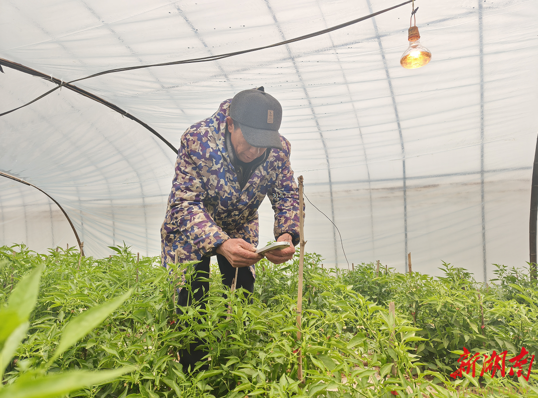 合作社负责人周湘龙正和工作人员弓腰查看辣椒苗长势,一边用温度计实测棚内温度,一般时不时停下脚步调试保温灯的悬挂高度,确保光线均匀覆盖每一株幼苗。他介绍,茄果类蔬菜生长适宜温度不能低于6℃,短时低温就可能导致花芽分化不良、生长滞缓,通过增温措施可有效降低极端低温带来的生长风险。