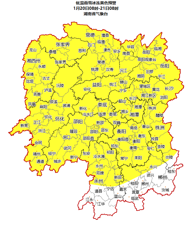 湖南省气象台1月20日07时发布低温雨雪冰冻黄色预警: