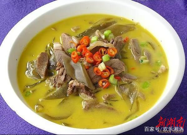 满桌的人都笑了。这成了他与湖南、与我们家,一场“味觉谈判”的开始。谈判的信物,就是这碗名不副实、底气十足的汤。 后来他说,明明是猪肉,偏叫羊肉;看着粗犷,入口才知内有乾坤——荷折皮滑溜,猪头肉软糯。味道更是层层叠叠:山胡椒油的奇香打头,老姜的辛辣随后,最后沉淀下来的,是文火慢熬四五个钟头的醇厚汤底。他说,这滋味像湖南的丘陵——望去温和,走进才知内里的棱角;要静下心,才能品出褶皱里的温柔。