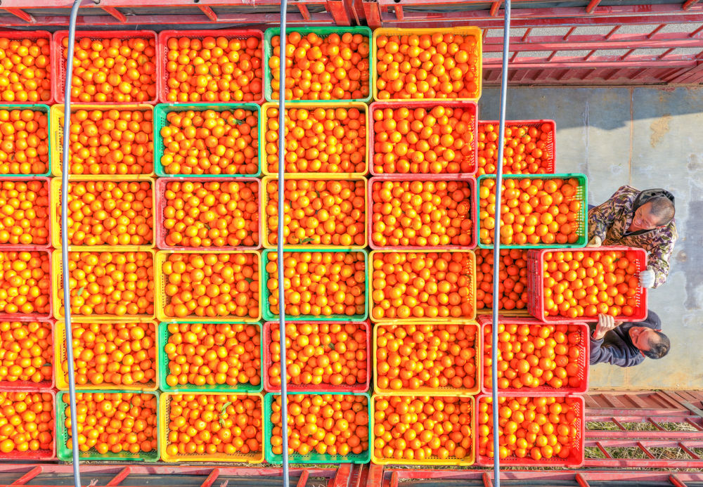 ↑2026年1月6日,湖南省永州市道县清塘镇楼田村濂溪柑橘种植示范基地,农民在装运沃柑。(无人机照片)CICPHOTO/蒋克青 摄责编:胡怡