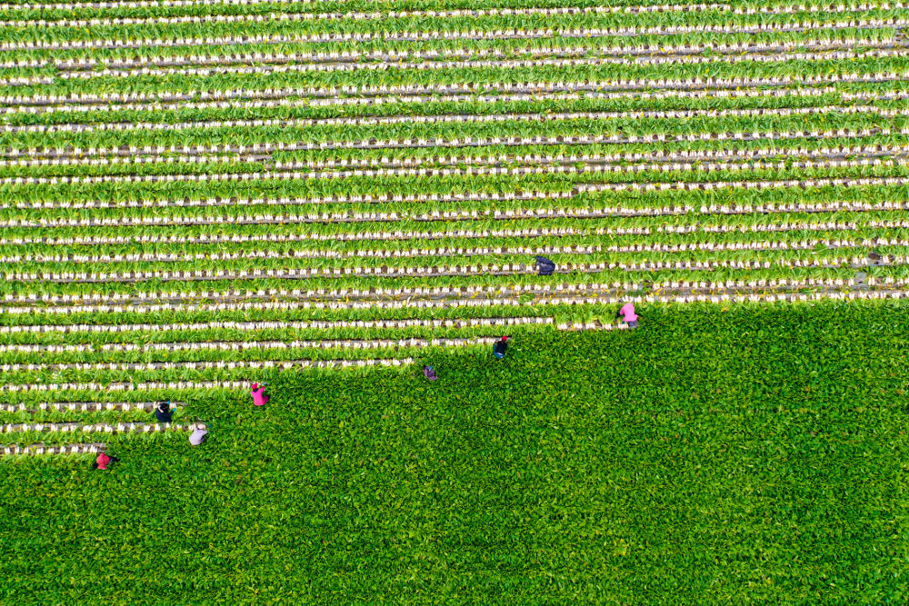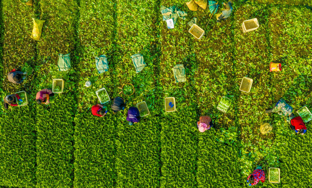↑2026年1月9日,重庆市南川区兴隆镇金花村,农民在田间采收菜心。(无人机照片)CICPHOTO/胡波 摄