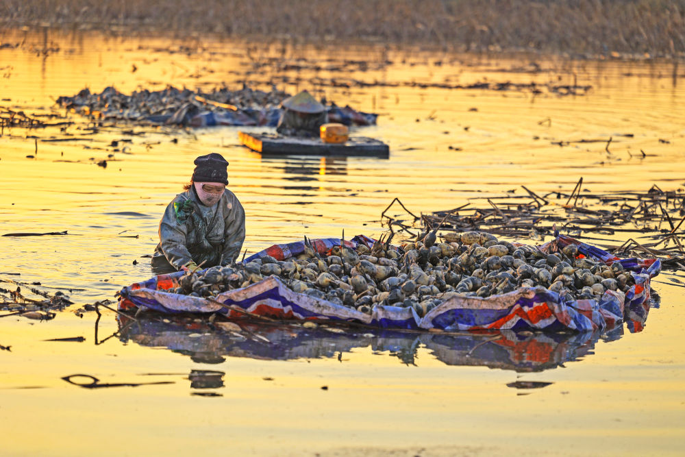 ↑2026年1月11日,安徽省安庆市宿松县省属农垦华阳河农场莲藕种植基地,农民在采收莲藕。CICPHOTO/李龙 摄