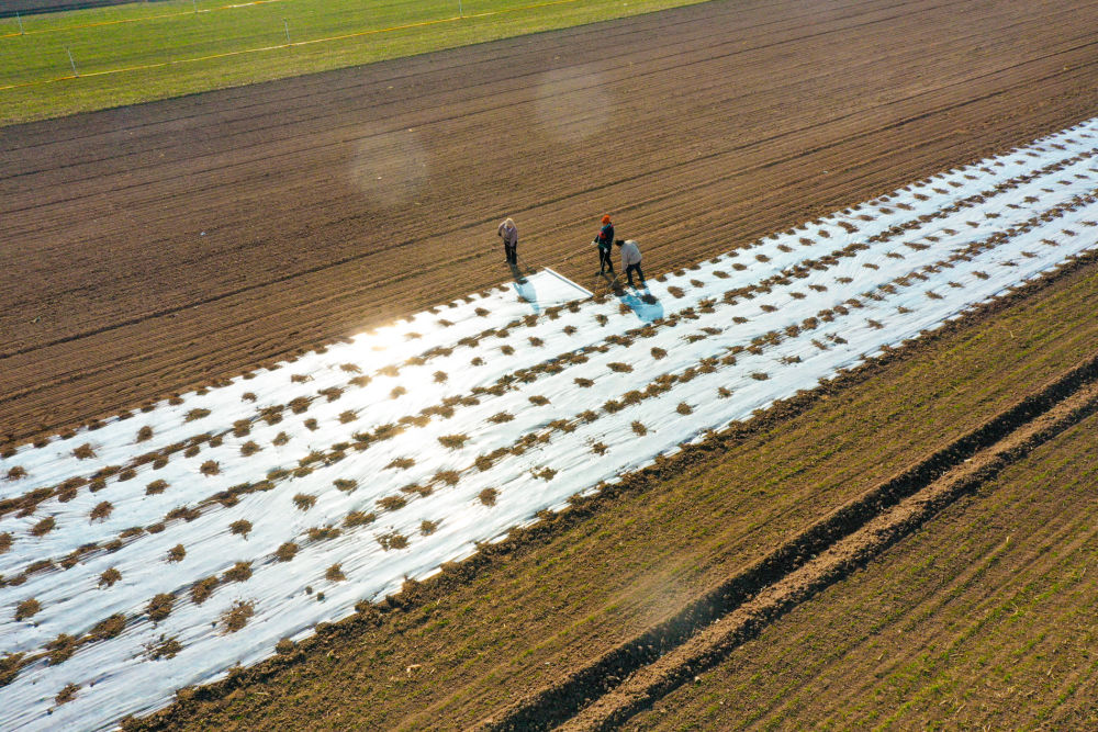 ↑2026年1月7日,河南省沁阳市柏香镇柏香一街村,农民在给麦田覆盖地膜。(无人机照片)CICPHOTO/杨帆 摄