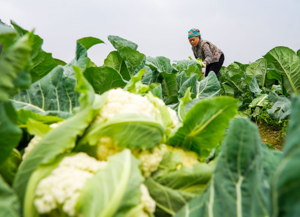 ↑2026年1月19日,贵州省从江县洛香镇上皮林村,农民在田间采摘花菜。CICPHOTO/卢忠南 摄