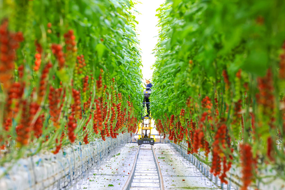 ↑2026年1月8日,河南省洛阳市伊滨区一处智能温室内,工人在采摘番茄。CICPHOTO/倪睿 摄
