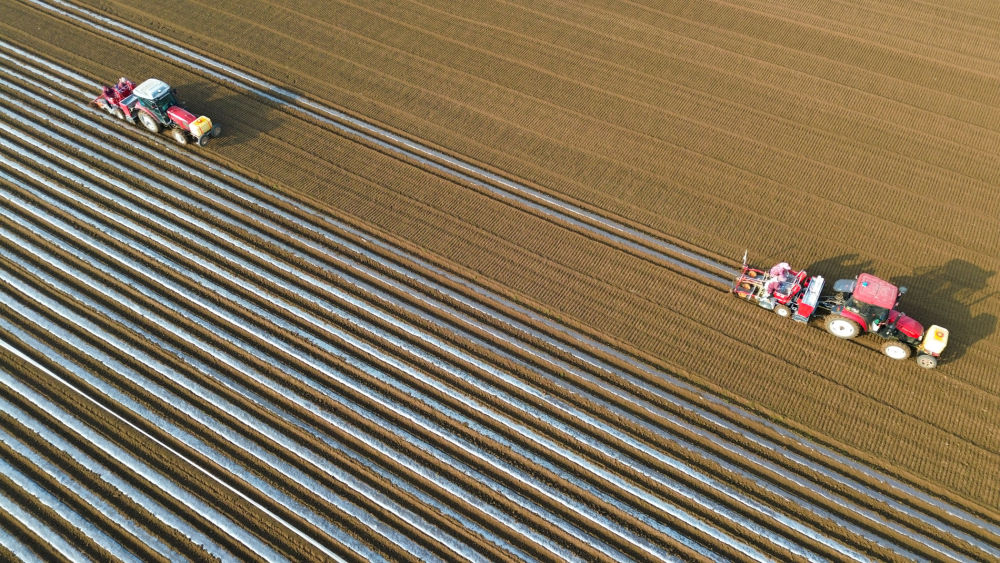 ↑2026年1月16日,河南省许昌市鄢陵县马坊镇马坊集村,农民在驾驶农机播种马铃薯。(无人机照片)CICPHOTO/牛书培 摄