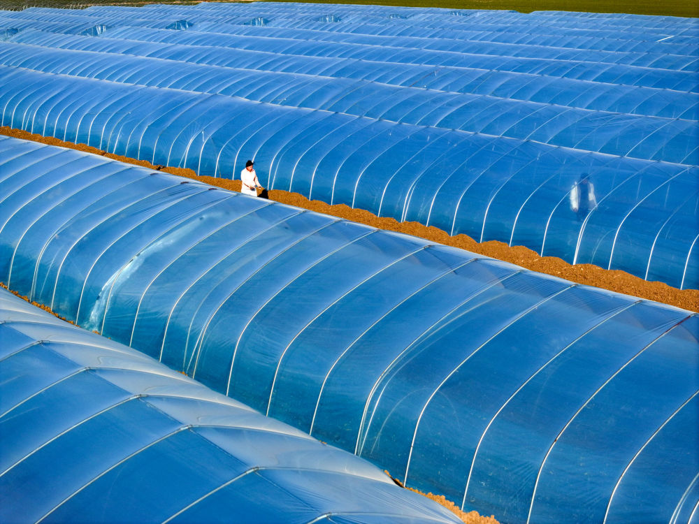 ↑2026年1月12日,安徽省亳州市蒙城县王集乡石山村,农民在给西瓜秧苗搭建塑料大棚。(无人机照片)CICPHOTO/胡卫国 摄