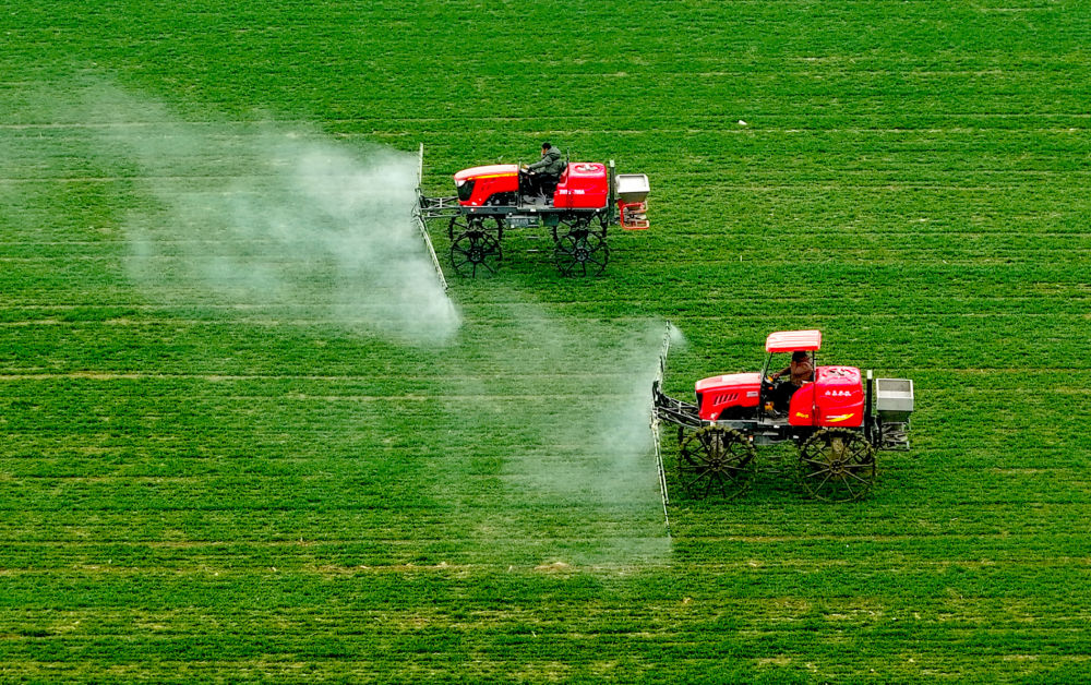 ↑2026年1月17日,安徽省亳州市利辛县胡集镇炉杨村,农民在驾驶自走式喷杆喷雾机对小麦进行喷药作业。(无人机照片)CICPHOTO/刘勤利 摄