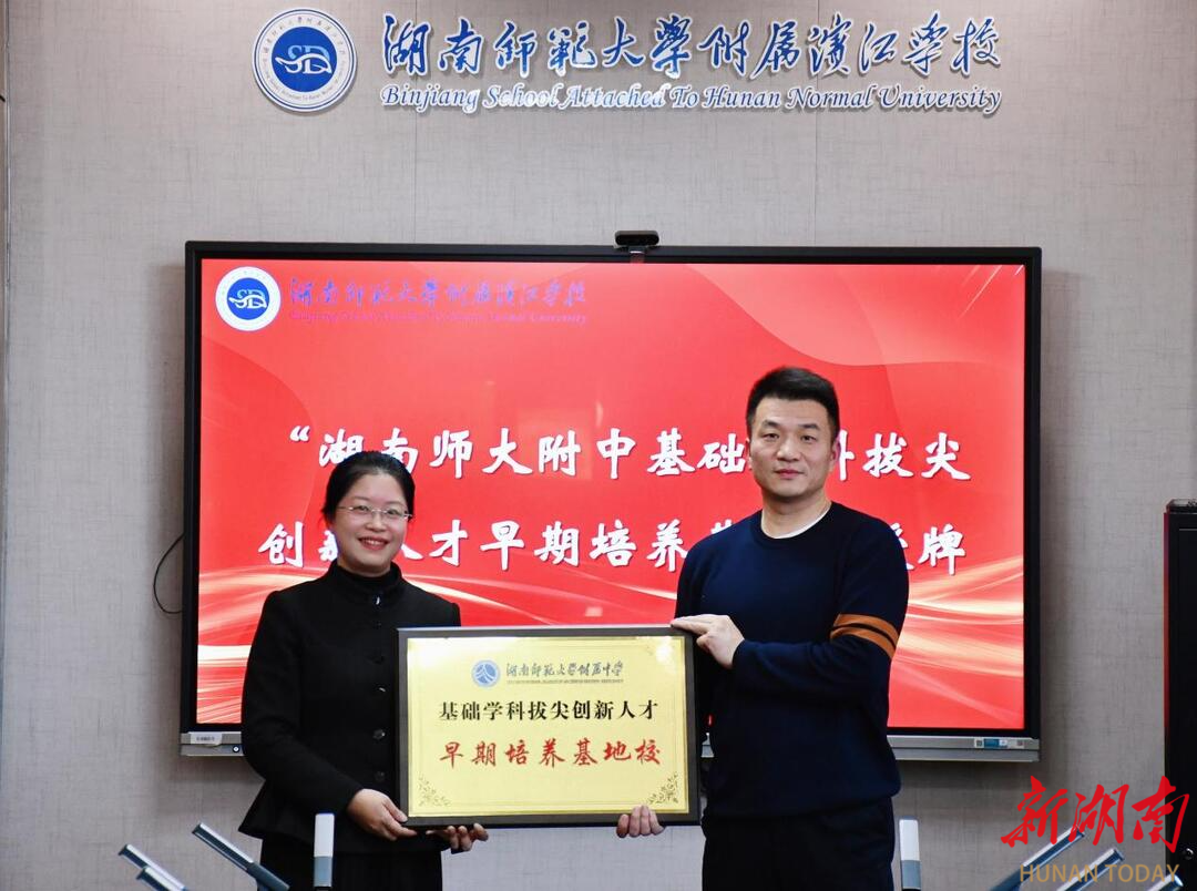 新湖南客户端1月20日讯(通讯员 张炘烨 邹晶洁)近日,湖南师大附属滨江学校迎来办学发展史上的重要里程碑——湖南师大附中基础学科拔尖创新人才早期培养基地正式落户。这一重要举措标志着该校在拔尖创新人才小初高贯通培养领域进入了更高层次的新境界,为师滨学子的成长成才搭建起更高层次的发展平台。湖南师大附中党委委员、副校长廖强,国际奥林匹克竞赛金牌教练、学科竞赛管理中心主任黄俊一行来到湖南师大附属滨江学校指导工作。仪式由学校党委委员、党政办主任彭娟主持。