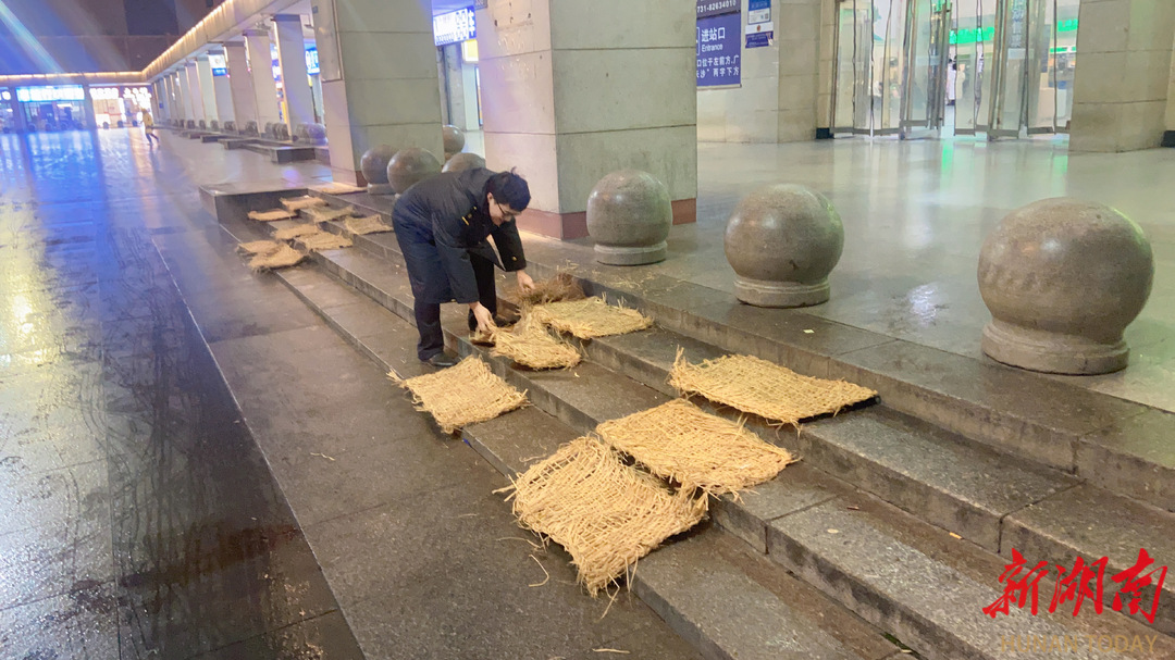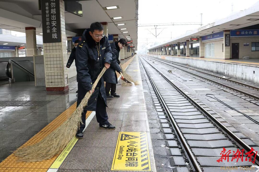 长沙火车站相关负责人表示,车站加强客运乘降组织,提前检查进出站口、站台、楼梯和电梯等旅客走行关键部位覆冰积雪情况,组织人力及时清扫,必要时铺撒防冻工业盐、防滑垫,确保旅客乘降安全。遇线路积雪影响列车运行时,组建除冰扫雪应急队伍,按“四班倒”方式24小时热备,对关键道岔进行深度清扫、涂防冻油,及时上线做好处置,维护列车运行秩序。