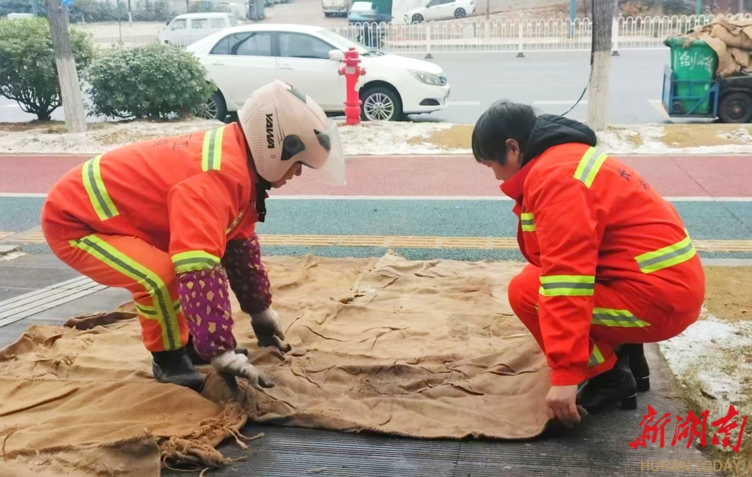 湘诚环境物业公司环卫工人涂购林、吴密香正在盼盼路1号站厕前铺设麻袋。