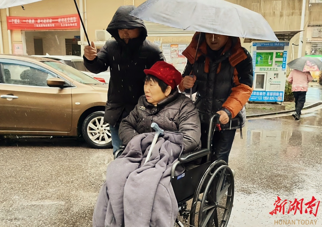 1月20日上午,家住丁家岭高层公寓的69岁残障居民曹岳辉,在丈夫陪伴下冒着风雪、坐着轮椅来到社区。业务办理结束后,考虑到夫妇俩年事已高、天气严寒,社工陈香婉立刻上前说道:“娭毑,我们送您回家!”她随即与同事方国栋、刘江一起,小心搀扶、稳稳推送,一路将两位老人安全护送到家。