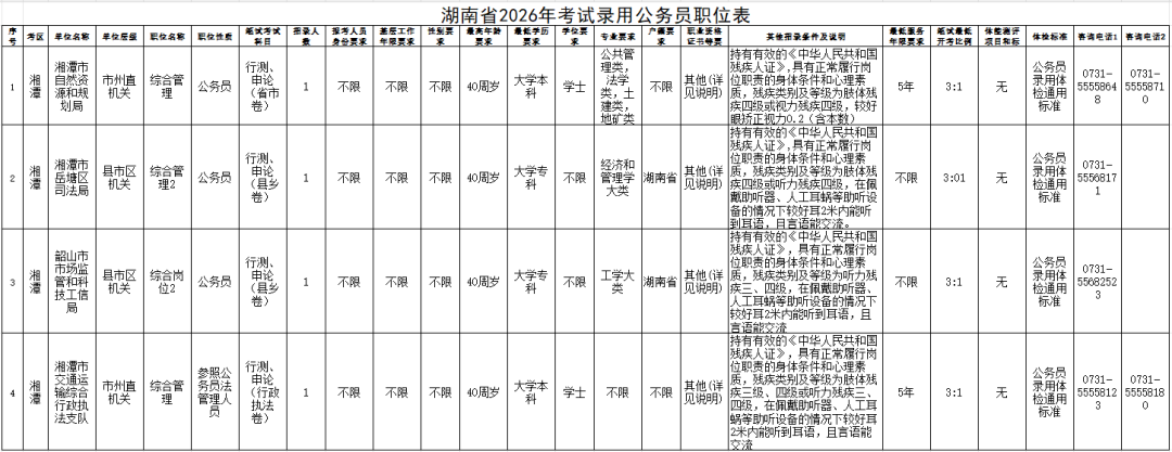 省公务员局日前发布《湖南省2026年考试录用公务员公告》(以下简称《公告》)。全省各级机关共计划招录公务员7080名,共定向招录59名残疾人,其中,湘潭市定向招录残疾人4名。