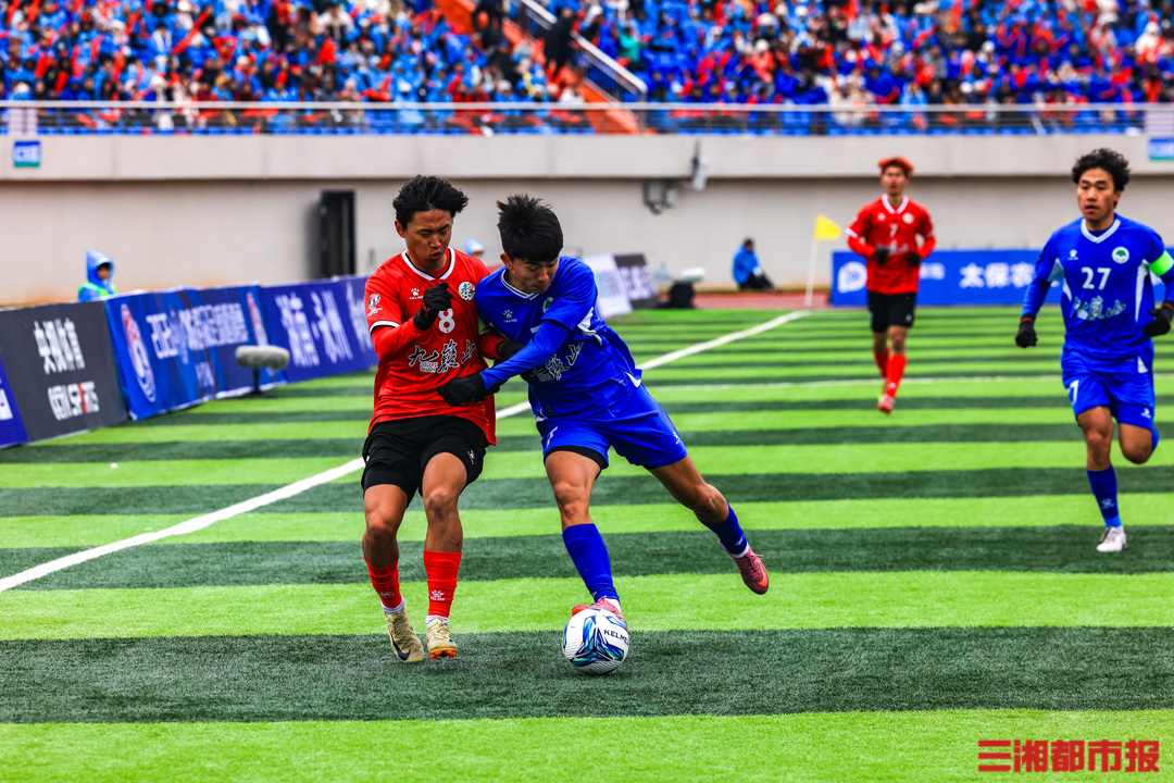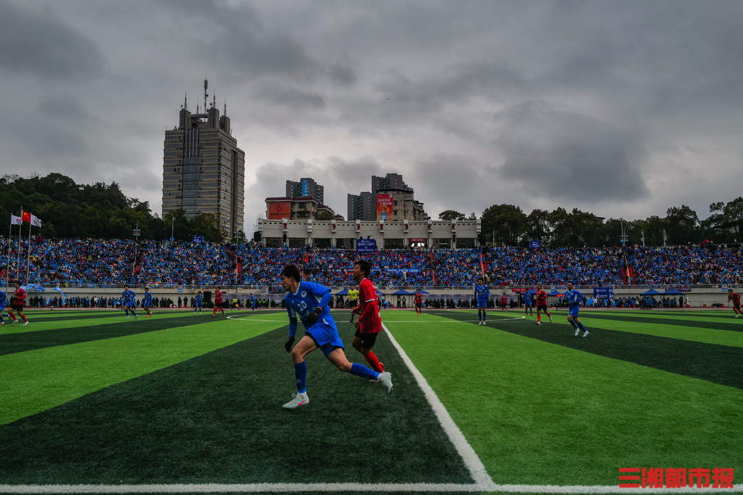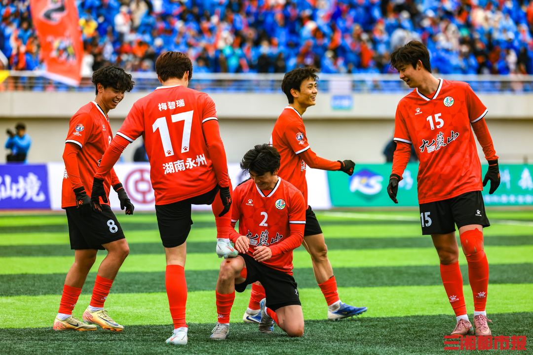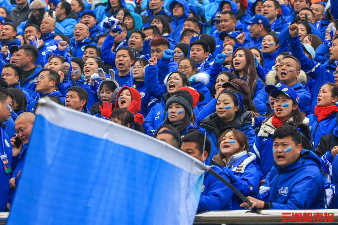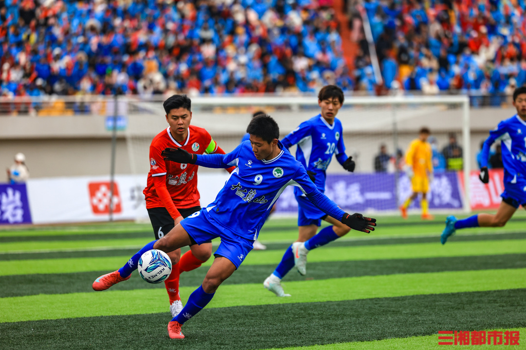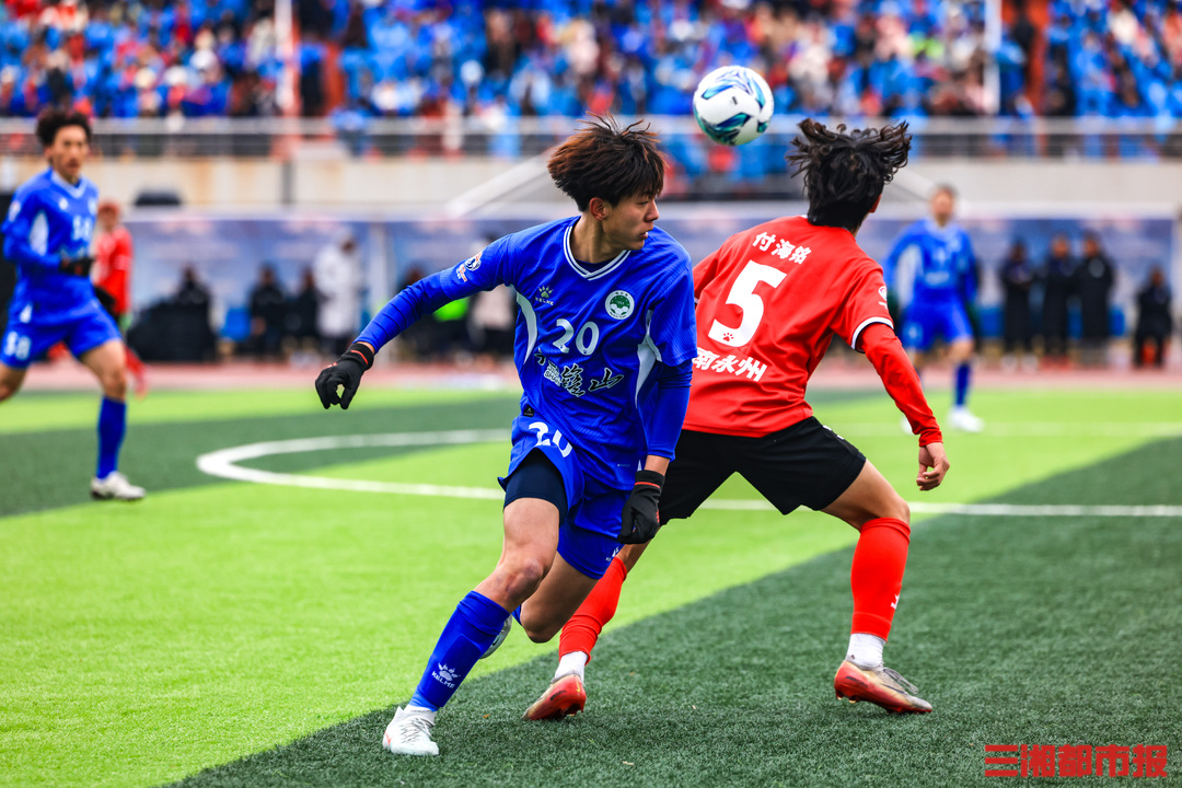 1月20日下午,寒潮来袭,永州市体育场,2026CMG群众足球邀请赛黑龙江哈尔滨队对阵湖南永州队,永州队17号梅碧瑞上演帽子戏法,尤其是第52分钟和第54分钟连进2球,最终永州队5比0大胜,足球再次点燃小城。(全媒体记者 刘丰 叶竹)