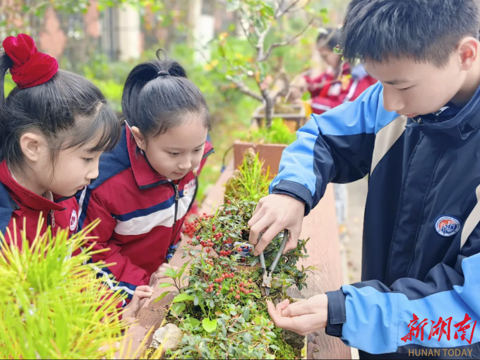 据悉,学校一直把园艺社团作为美育特色品牌,从最初的15人,发展到如今覆盖130余名学生。孩子们在校园里种植梨、老鸦柿、胡颓子、火棘等14种观果植物,打造了70余盆盆景作品,还在适心小径建起了盆景展台,让校园变成了四季有果、处处有景的微缩园林。学校每学期都会开放园艺展览,累计展出作品210余件,让孩子们的劳动成果被看见、被认可。