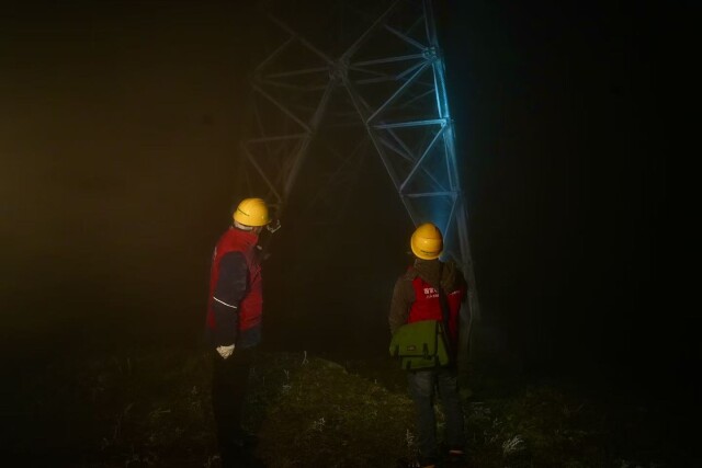(工作人员夜间在天堂山110千伏印天线117号塔监测模拟导线覆冰厚度。汪继生摄)
