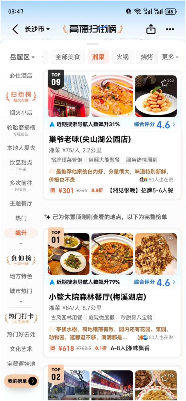 与依赖主观点评的榜单不同,高德扫街榜的排名核心依据用户的真实导航行为。这种“用脚投票”的机制,让许多不善线上营销但品质扎实的长沙本地商户获得了公平的曝光机会。