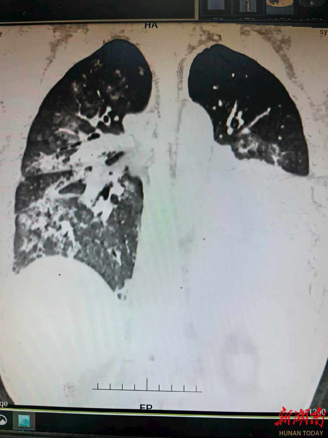 “面对如此复杂的危重症,单靠一个科室不可能完成,而湘雅医院综合救治能力是患者安全的最大托举。”湘雅医院急诊科李湘民主任介绍,76天里多学科团队如同精密运作的救援网络。急诊、血液、重症、胸外、呼吸、介入、输血等科室深度协作,进行了4次大型多学科会诊。支气管镜做了12次,胃镜6次,CT引导下的肺脓肿穿刺引流2次,前期还进行了2周持续血液净化治疗,他感叹:“每一天都是在和死神赛跑”。