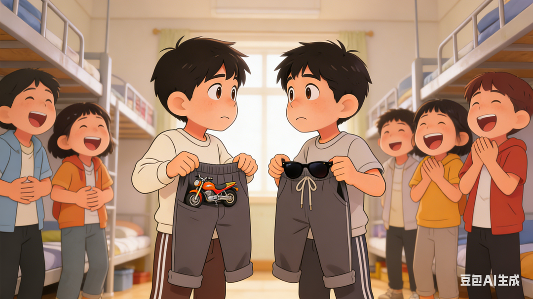第二天早上,大家起床很匆忙,生怕迟到。慌乱中,我抓起一条裤子穿好,一摸口袋,里面居然有辆玩具摩托车——我记得这是徐徐从家里带来的。我立刻意识到,可能穿错裤子了。仔细一看,这明明就是我的裤子。就在这时,徐徐大喊:“我裤袋里为什么有个墨镜?我明明放的是摩托车!”我俩疑惑地走到一块,对比发现,我们的裤子竟然一模一样,连码数都相同。全寝同学看到我们面面相觑的样子,捧腹大笑。