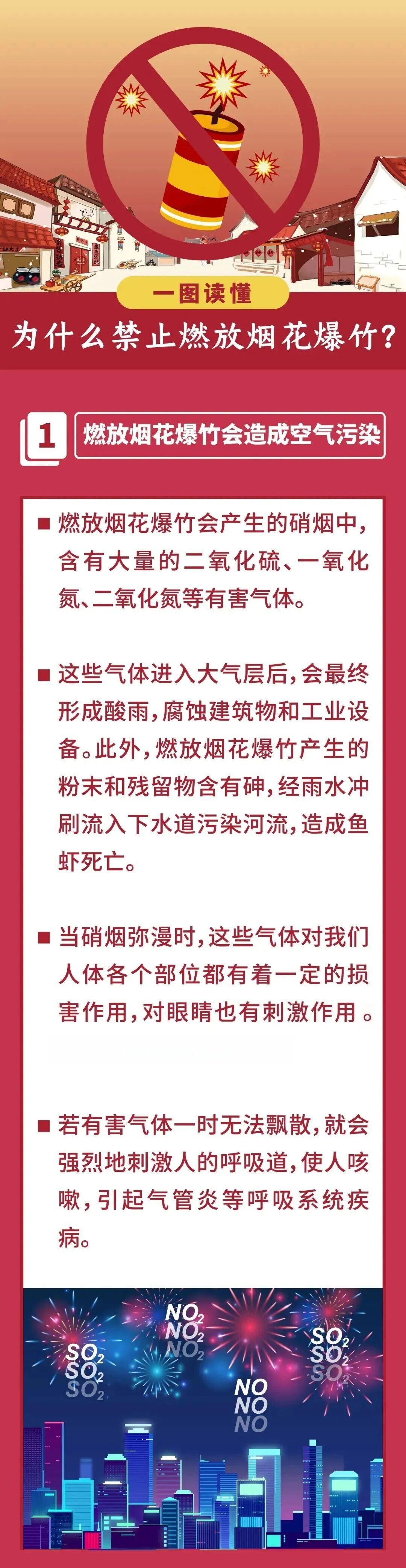 燃放烟花爆竹是污染空气、影响市容、噪音扰民的重要因素之一,且极易引发火灾和安全事故,造成人员伤亡和财产损失。@全体居民朋友,请自觉遵守禁限燃放规定,共同努力守护城市的美好蓝天。