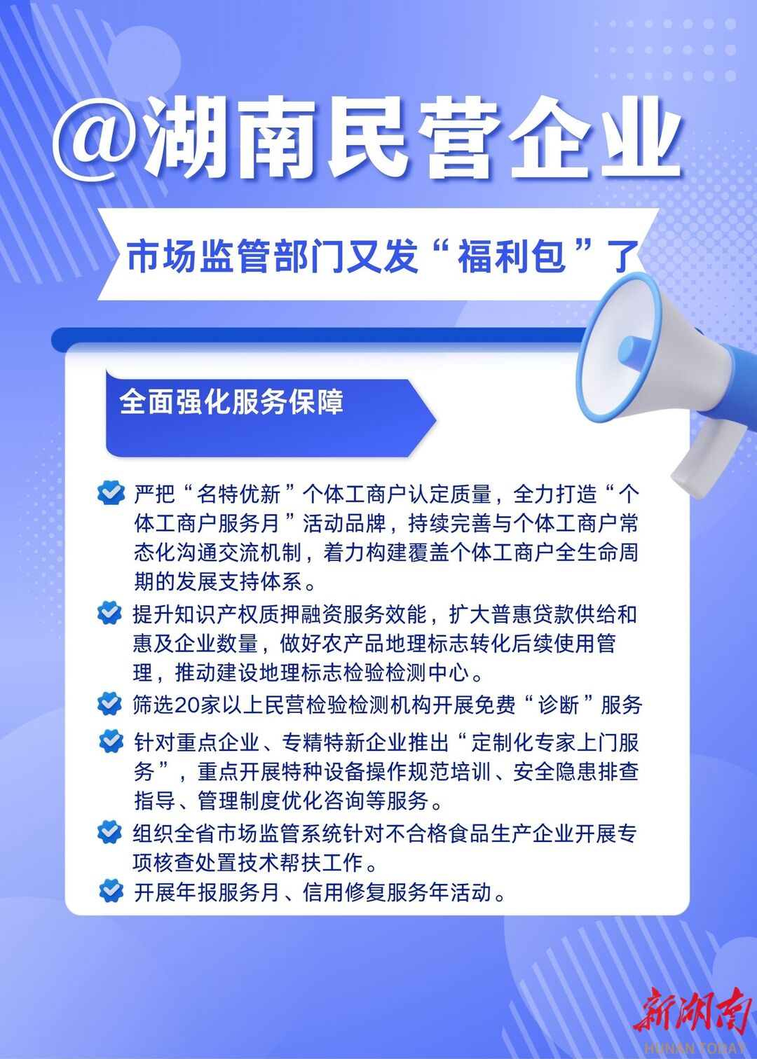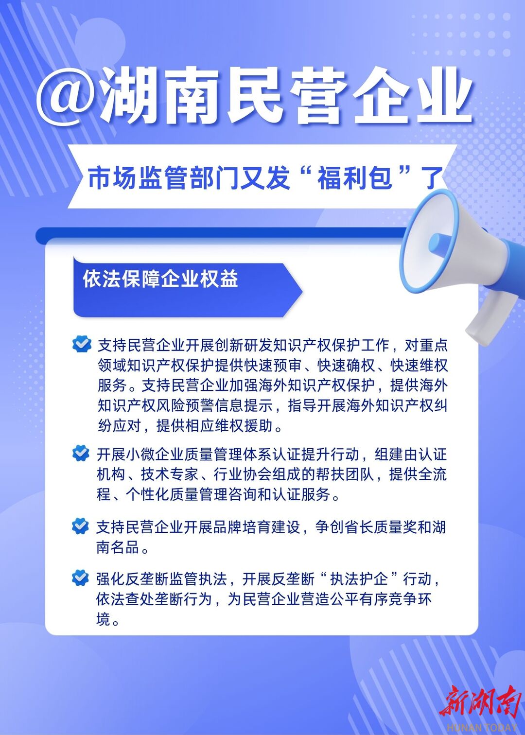 在依法保障企业权益上,针对重点领域知识产权保护,提供快速预审、快速确权、快速维权“三快”服务,同步助力民营企业应对海外知识产权纠纷、做好风险预警。开展小微企业质量管理体系认证提升行动,积极支持企业争创省长质量奖、湖南名品,常态化开展反垄断“执法护企”行动,持续筑牢公平有序的市场竞争防线。