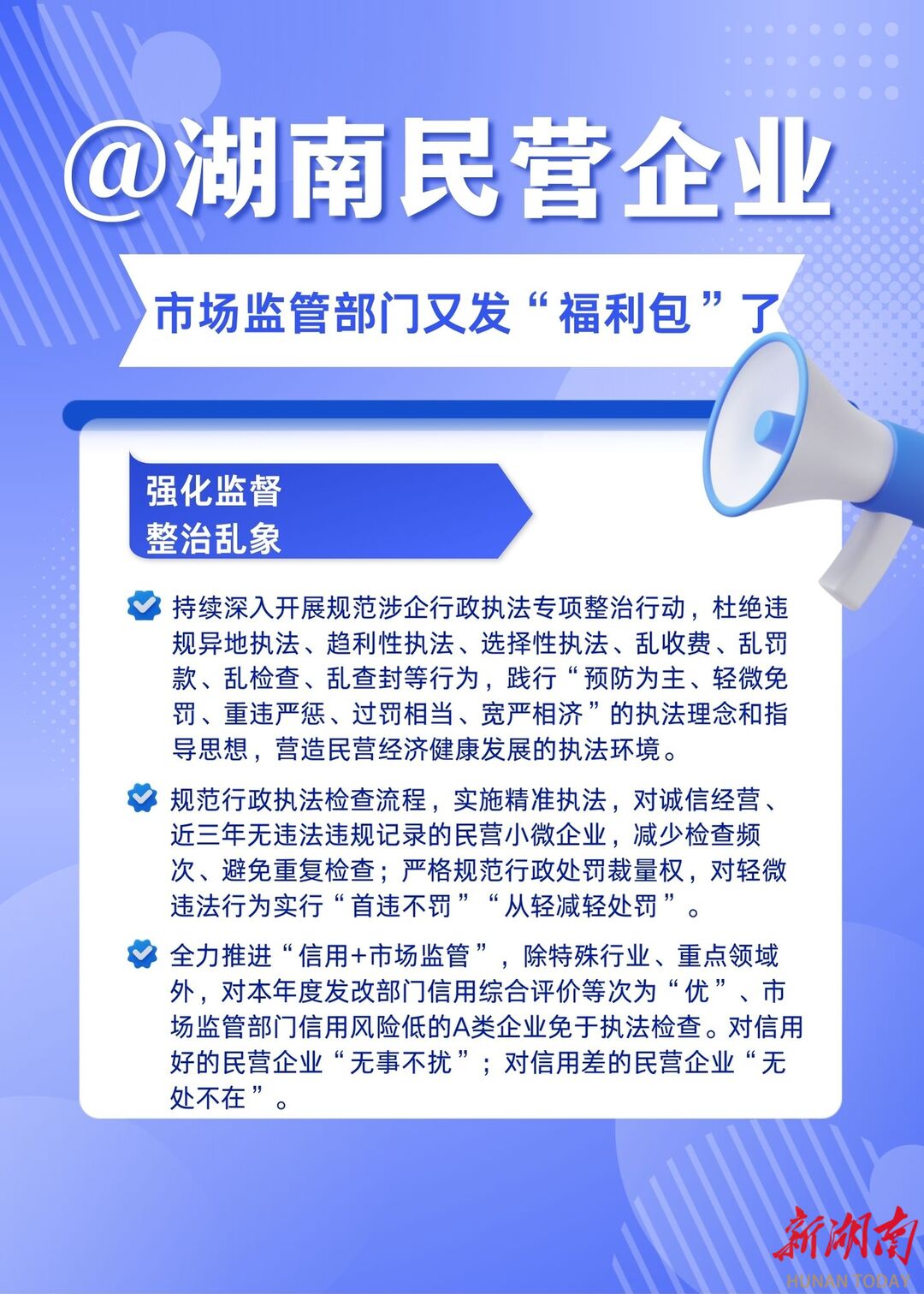 在强化监督整治乱象方面,坚持规范执法与包容审慎并重。深入开展涉企行政执法专项整治,坚决杜绝违规异地执法、趋利性执法、乱检查等行为,严格践行柔性执法理念,全面落实“首违不罚”“从轻减轻处罚”制度。构建“信用+市场监管”新型模式,对信用优良的民营企业做到“无事不扰、有求必应”,对失信企业强化精准监管、保持“无处不在、利剑高悬”的震慑态势。