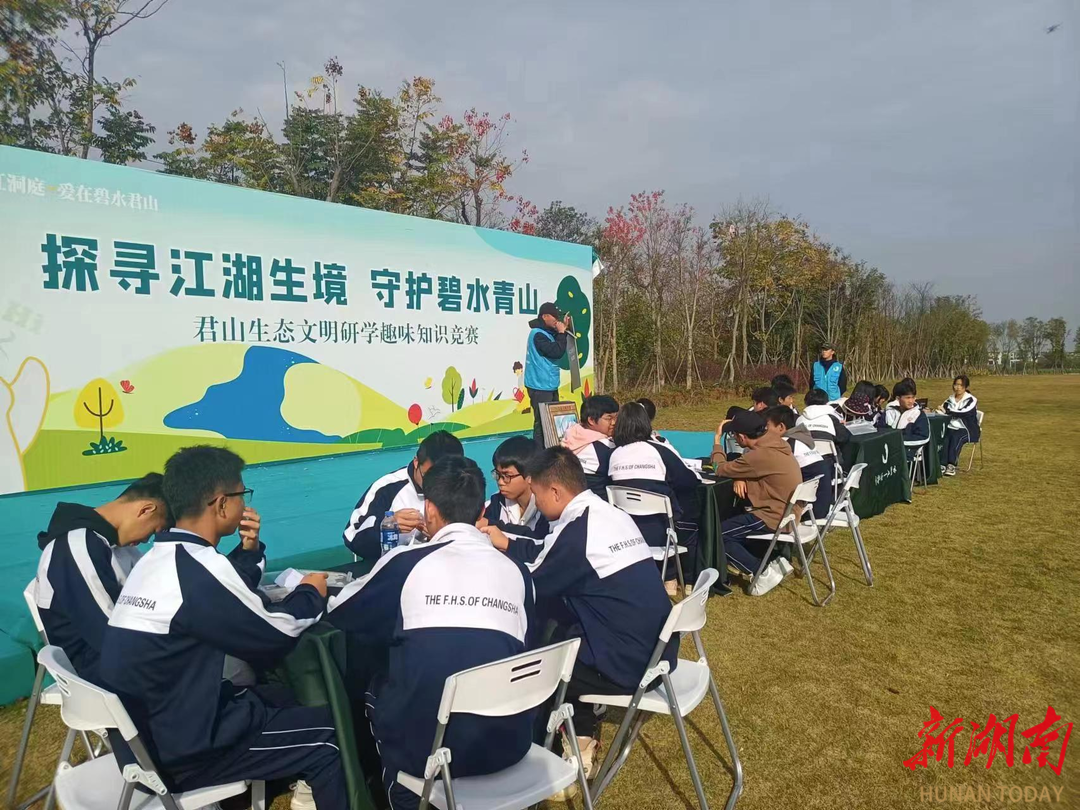 (暖阳下的君山,学生积极参与生态文明研学知识竞赛)