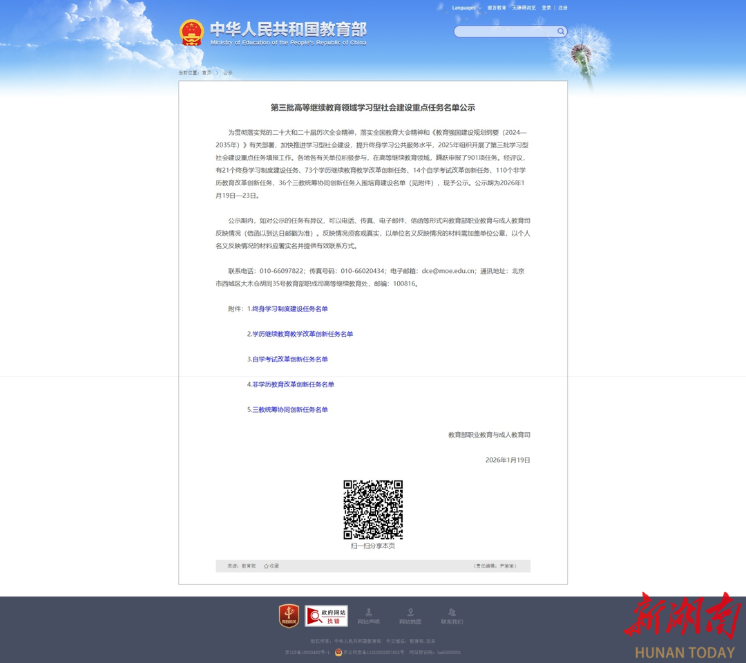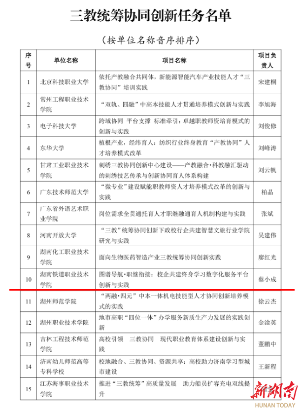 湖南日报·新湖南客户端1月21日讯(通讯员 李天姣)近日,教育部职业教育与成人教育司公布了《第三批高等继续教育领域学习型社会建设重点任务名单公示》,由湖南铁道职业技术学院继续教育学院与轨道交通运输学院联合申报的“图谱导航・职继衔接:校企共建终身学习数字化服务平台创新与实践”项目成功入选“三教统筹协同创新任务”培育建设名单。这是该校继第一批、第二批之后,第三次斩获此项殊荣,彰显了该校在高等继续教育改革创新领域的持续引领力。