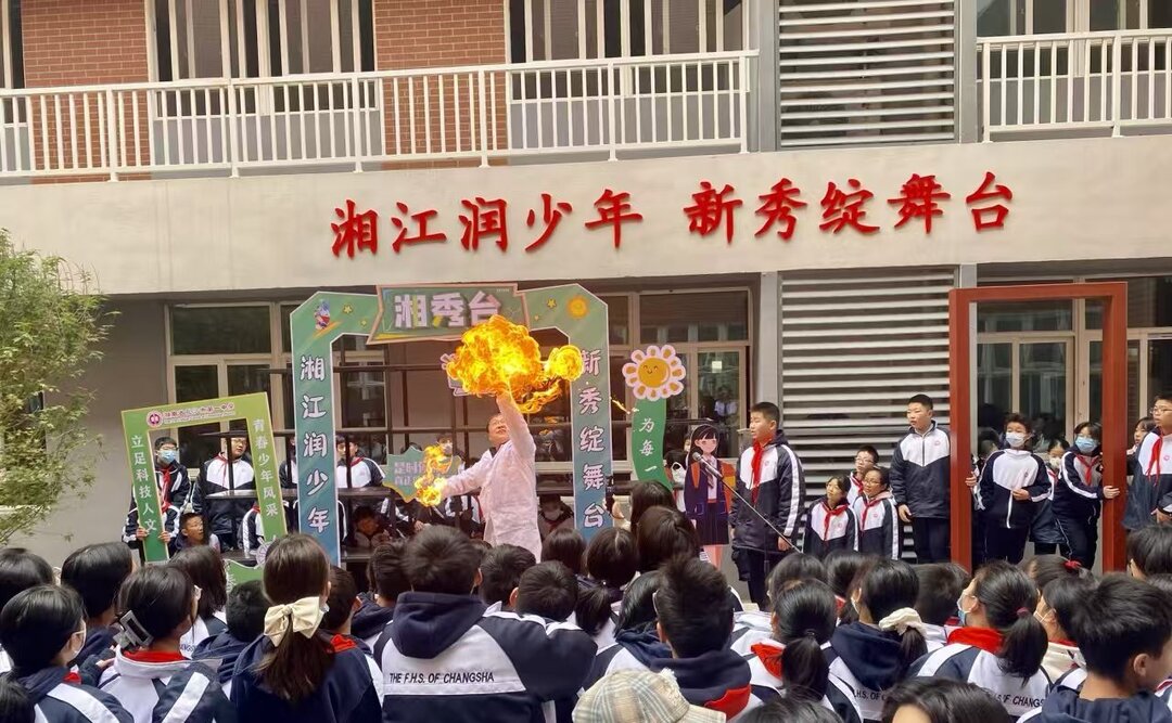 这里有“每个人都发光”的育人初心,午饭后15分钟的“湘秀台”上,不仅有学生们钢琴流淌的旋律、古筝萦绕的古韵,更有唐军书记的科学秀表演,奇妙的实验现象点燃孩子们探索未知的热情;刘英校长带头嗨唱经典歌曲,用活力与亲和力拉近与学生的距离,无彩排的热爱展演让每个孩子都能成为主角,在自信展示中绽放少年锋芒。