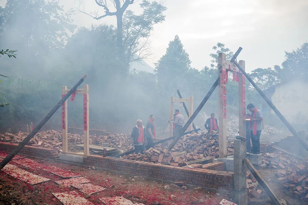 2025年5月25日,汝城县土桥镇山口东村,新房工地上,村民围拢木门举行立门仪式,寄托安居乐业的美好祈愿。