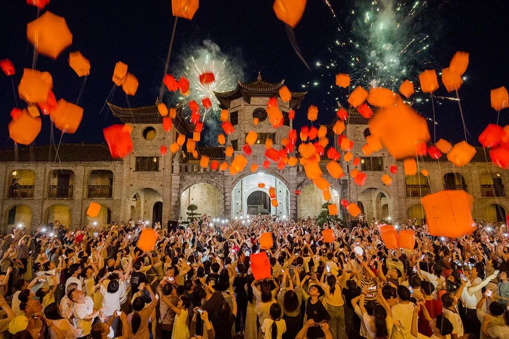 2025年10月6日,汝城县卢阳镇朱氏宗祠,中秋夜,千盏天灯齐飞,烟花绽放,祈愿随光影升腾。