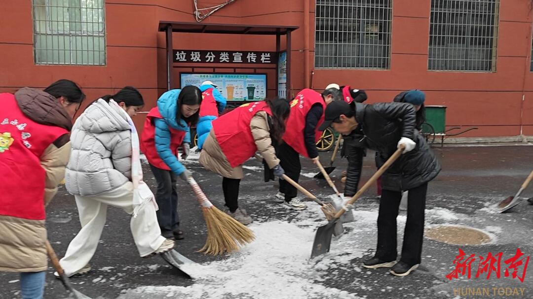 号召一经发出,“哐当、哐当”的破冰声在寂静的校园里响起。在龚英芝的带动下,党员教师、行政人员纷纷加入除冰队伍,大家分工协作、默契配合:有的握紧铁锹奋力破冰,有的手持扫帚清扫残冰,有的推着推车转运碎块,寒风中忙碌的身影构成了校园里最温暖的风景线。