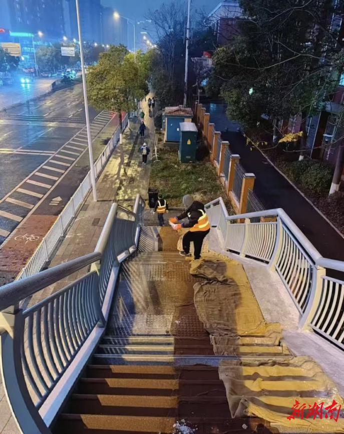 在作业过程中,市政中心采取“机械为主、人工为辅、重点攻坚”模式,对湘府路快速路高架桥、麓景路隧道、欢乐城隧道等重要点位开展多轮撒盐除冰作业,累计撒布融雪剂20吨,铺设防滑麻袋200余个。为保障行人出行安全,在全区14余座人行天桥增设安全通行警示标识,并铺设防滑麻袋800余个。