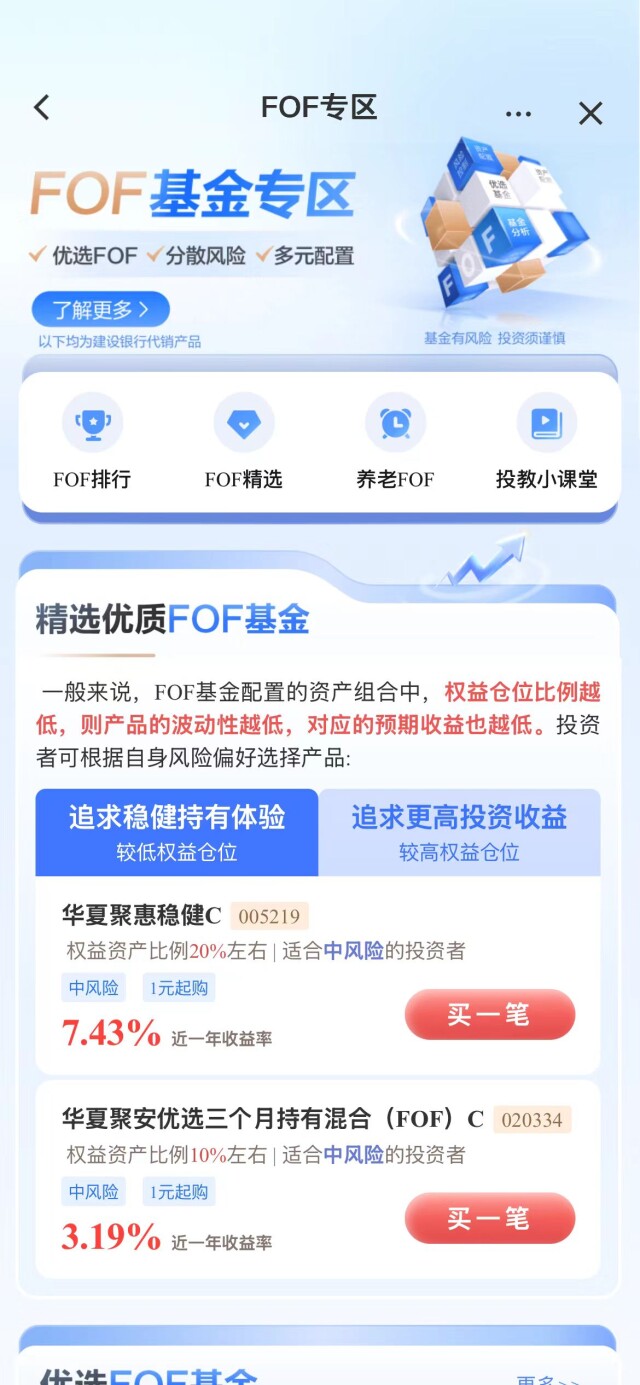 建设银行今年1月1日正式推出“龙盈计划”,产品涵盖“定制低波-多资产FOF”“中低波-多资产FOF”等系列,通过科学的大类资产配置与风险预算管理,力求在严控回撤的前提下实现稳健收益。该行理财经理介绍,该行推出的“龙钱宝1号”配置了其代销的10只现金管理类理财产品,1分起购,不仅每日计算收益,还能直接用于刷卡、网购,支付时自动赎回补款,建议春节期间短期灵活性资金选择该产品。