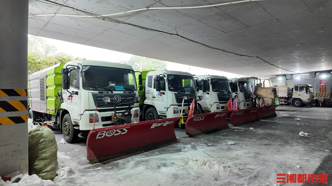 这场与风雪的较量中,坚守的不止环卫工人。1月20日深夜至21日清晨,湘江新区行政执法局市政中心的作业车辆穿梭在城市各处,对湘府路快速路高架桥、麓景路隧道、欢乐城隧道等关键点位开展多轮作业,撒布融雪剂20吨,铺设防滑麻袋200余个。