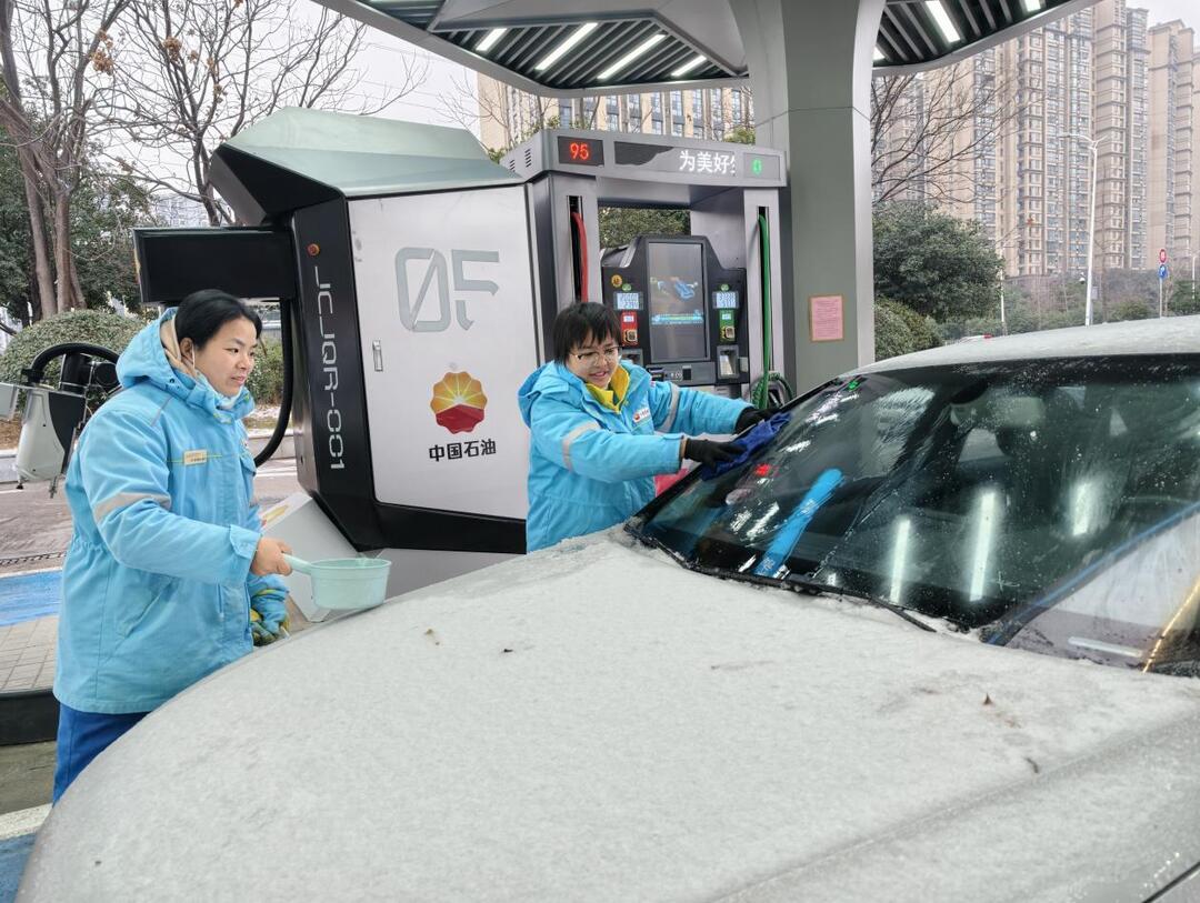 中国石油湖南销售湘潭、郴州分公司针对柴油车结蜡问题及时预警并储备抗凝剂,在加油通道、营业厅等重点区域铺设防滑设施、张贴安全提示标识,安排专人引导车辆有序通行;员工每日清晨熬制红糖姜茶,为进站客户以及环卫工人、外卖骑手等户外工作者免费供应。郴州龙泉路加油站在复合剂货架旁放置玻璃水喷壶、干净抹布,免费为车主擦拭车窗,解决寒冬车玻璃起雾、沾污影响视线的难题。
