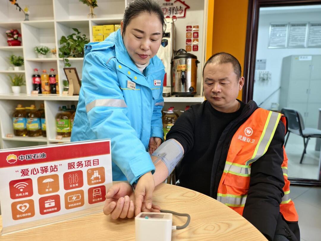 “谢谢你们帮我测血压,冬天一冻着就容易头疼。”中国石油湖南销售常张分公司不仅为户外工作者提供血压测量和应急医药箱服务,还提前备足融雪盐、防滑垫、除雪工具等用品,对站区进出口、加油机周边开展地毯式清雪除冰,扫清车主出行障碍。