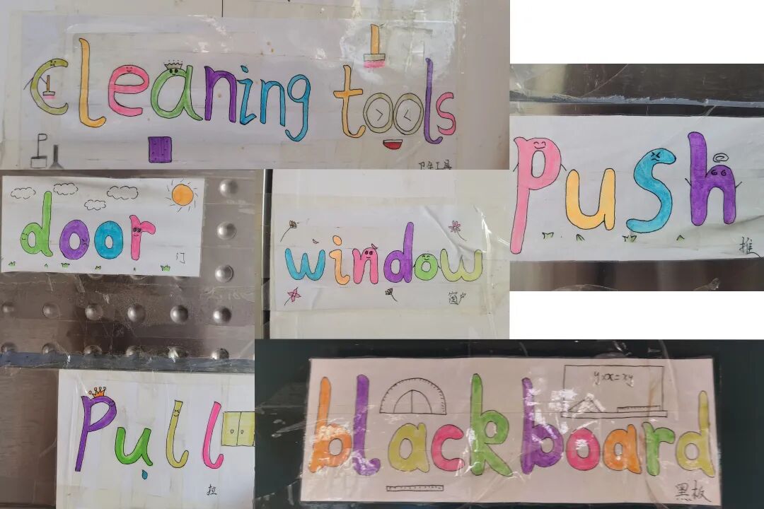 没想到,当天晚课结束,她就拿着写满单词的纸条来找我核对。两天后,我再走进教室时,愣住了——讲台、粉笔盒、黑板、书架、甚至垃圾桶上,都贴上了手绘的单词卡。黑板上的课表,也换成了英文版。